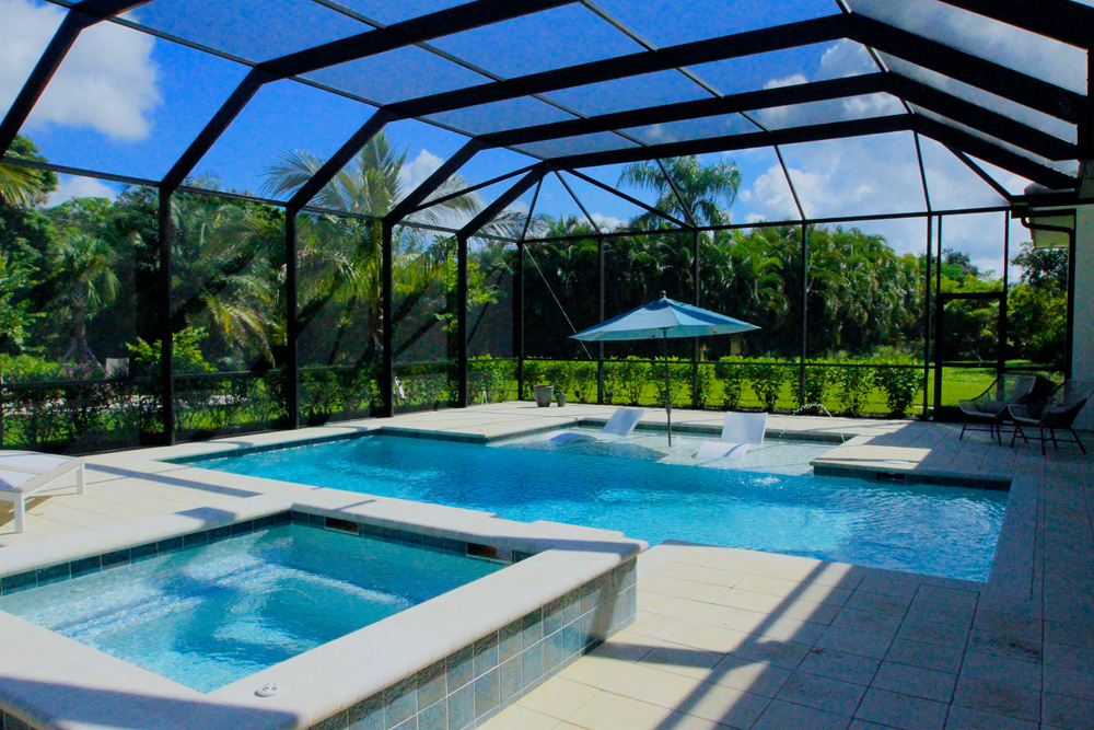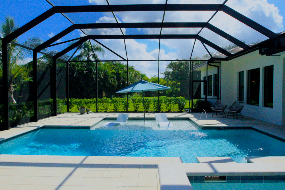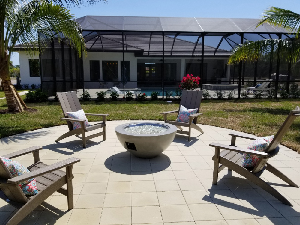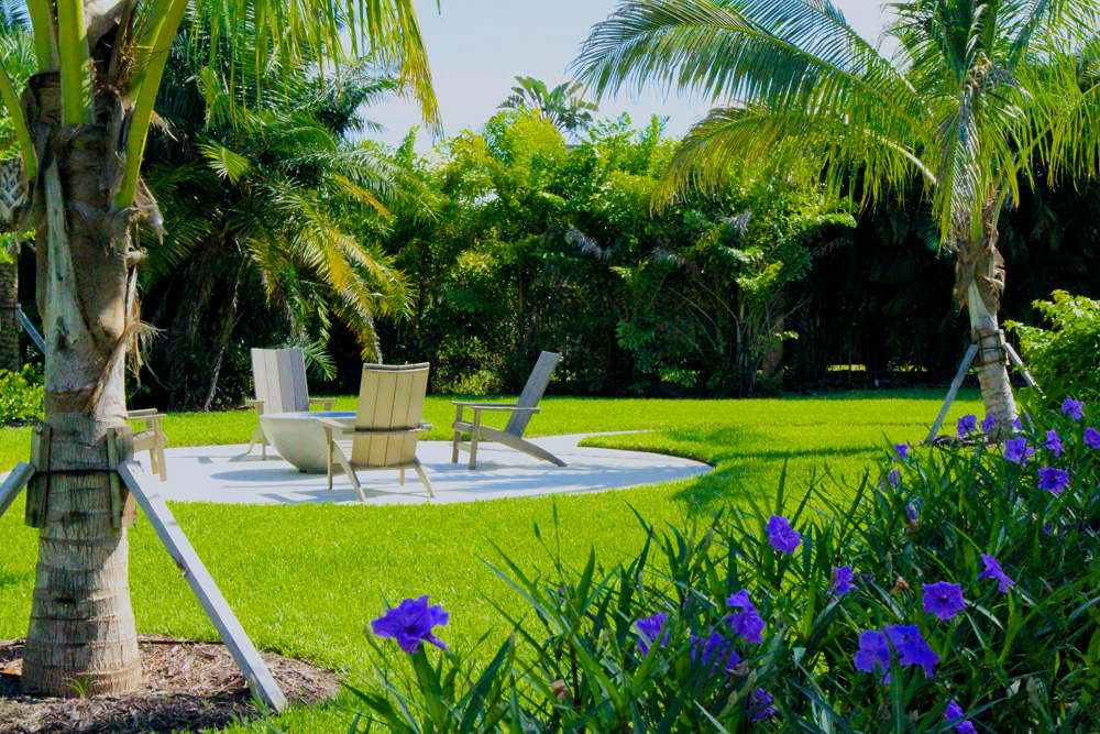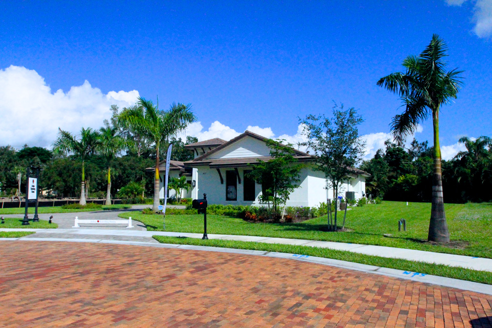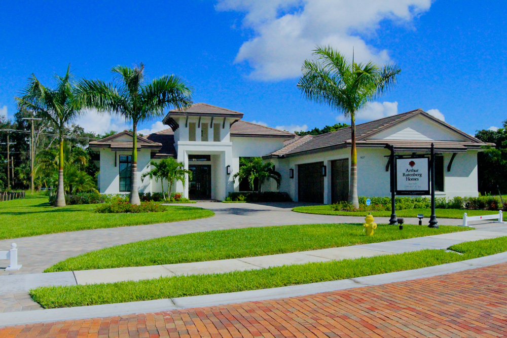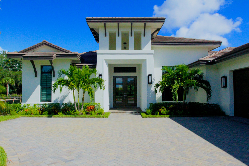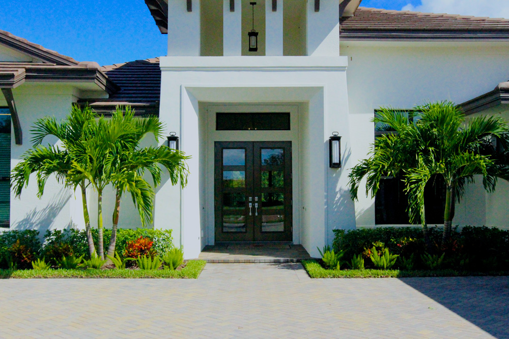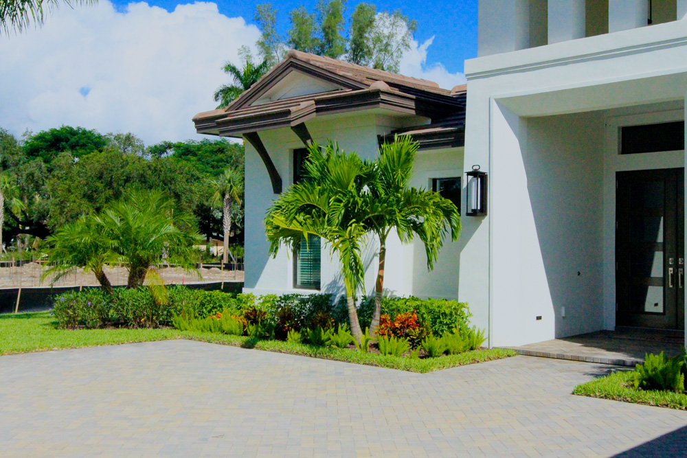 This coastal contemporary style home built by Arthur Rutenberg Homes features a well balanced and symmetrical landscape design. Shrubs and groundcover are layered to create depth and an assortment of color and textures. The clean lines and sharp corner of the front elevation are softened with the strategic placement of multiple trunk palms. As you make your way from the pool to the backyard you are guided by an elegant walkway leading out to a welcoming fire pit. Hegde rows are placed along the property lines to assist in adding privacy and depth to the lot.