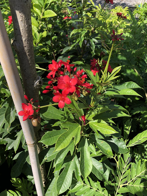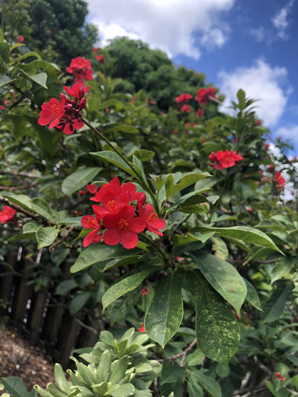 This evergreen shrub is a flowering specimen that will attract butterflies and hummingbirds. All parts of this plant are poisonous, so make sure to be cautious with pets or children around this tree. The Jatropha reaches about 15 feet and its star-shaped flowers are typically red.