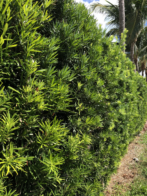 The Podocarpus’s small needle-like leaves give the foliage a soft appearance when grown into a hedge or large tree. This tree is typically pruned to stay around 5-8 feet, but if left to grow can exceed heights of 30 feet. Being salt and heat-tolerant makes this plant a great option for coastal properties.